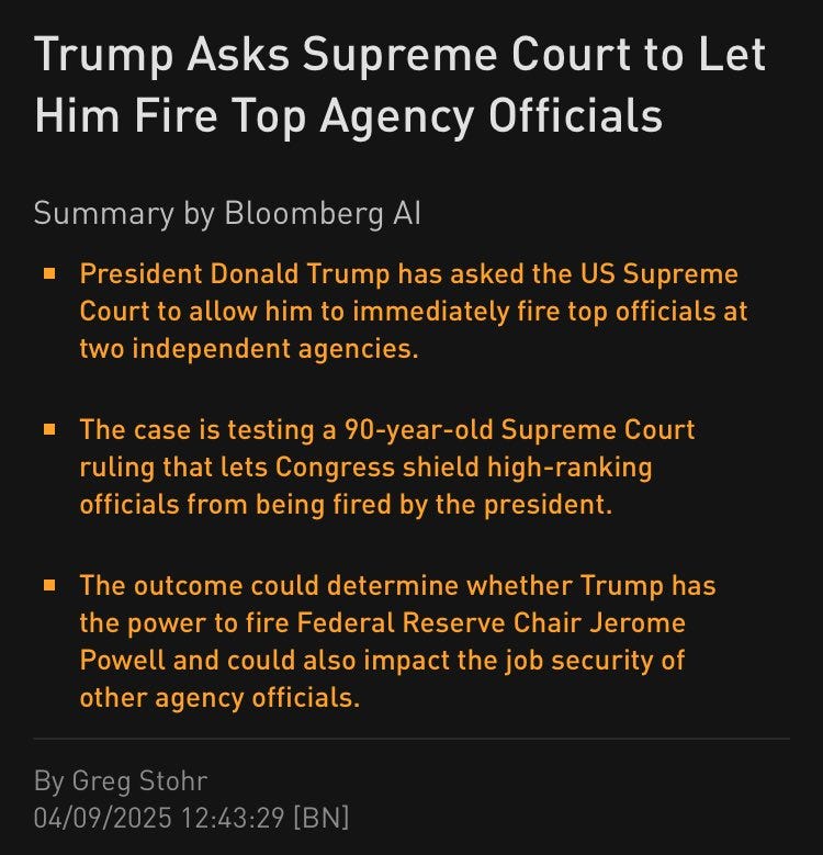Here’s some interesting drama this morning that I just came across. President Trump is asking the Supreme Court to let him fire top agency officials. According to Bloomberg, this could determine whether he has the power to fire Fed Chair Powell.