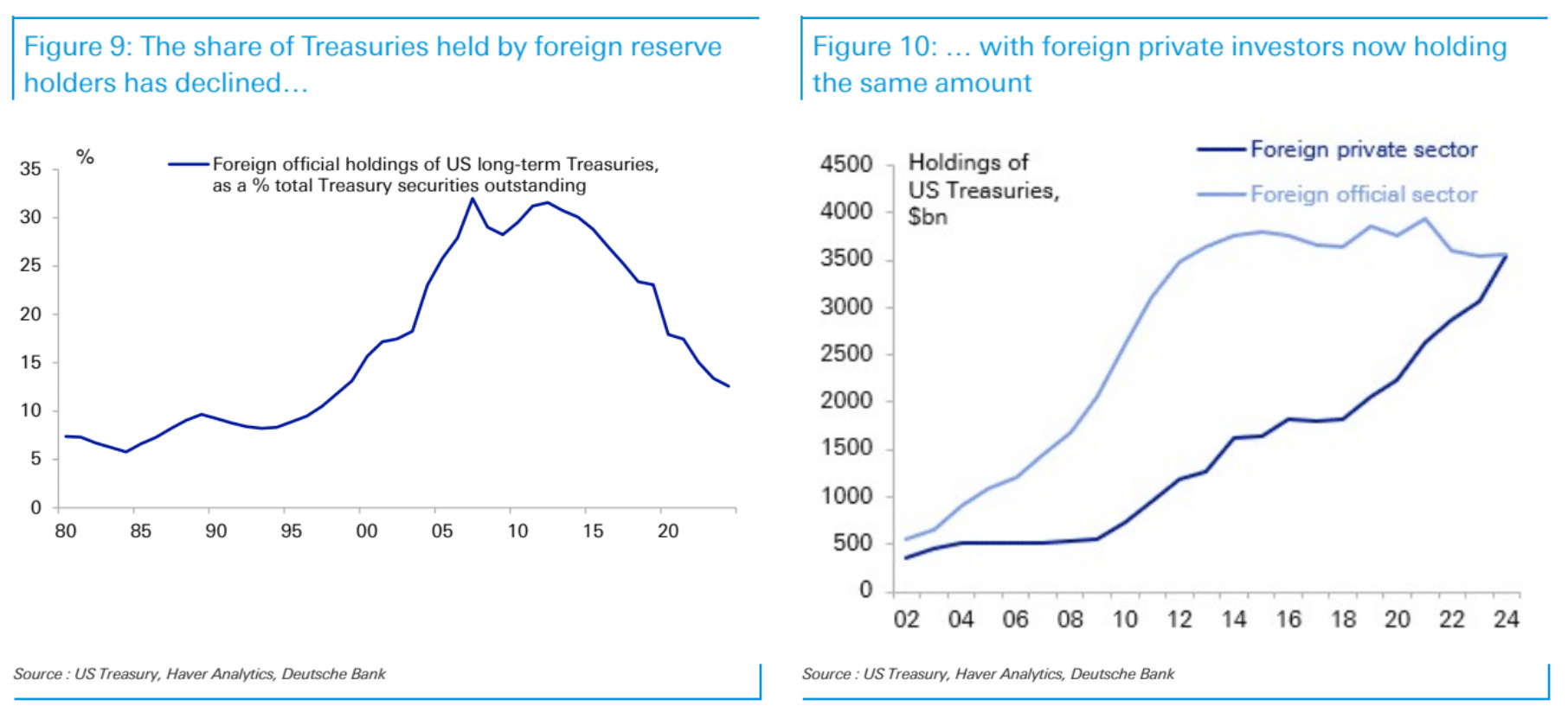 This is a great set of charts from DB. Yesterday, we talked about China, and overseas investors possibly dumping US treasuries, leading to some of the decline in price. These charts suggest that the dumping had actually started a while back but what’s also interesting is that while official sectors have been lowering their positions, foreign private sectors have been filling the void.