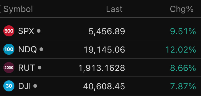 What a day we had yesterday! Going from a gloomy market environment to a 12% jump in the Nasdaq. All broad market indices were up after President Trump posted about “buying” and later followed that up with an announcement to pause reciprocal tariffs for 90 days for countries that had reached out for negotiations.