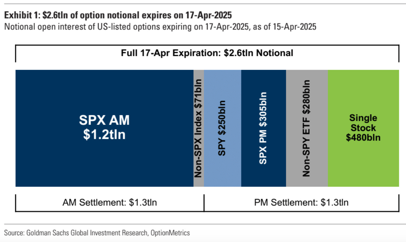 Goldman Sachs estimates that over $2.6 trillion of notional options exposure will expire tomorrow (04/17), including $1.2 trillion of SPX options and $480 billion notional of single stock options.
