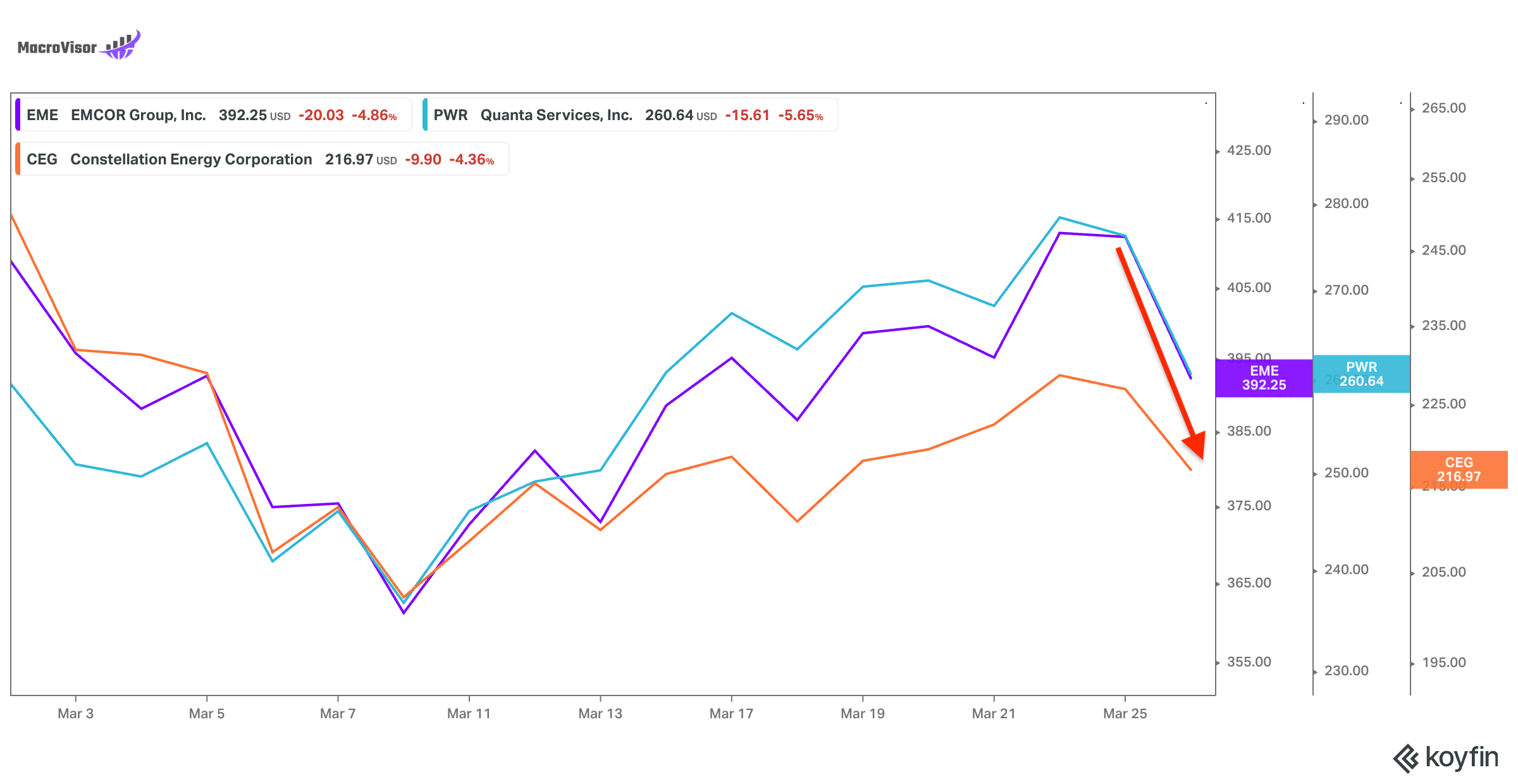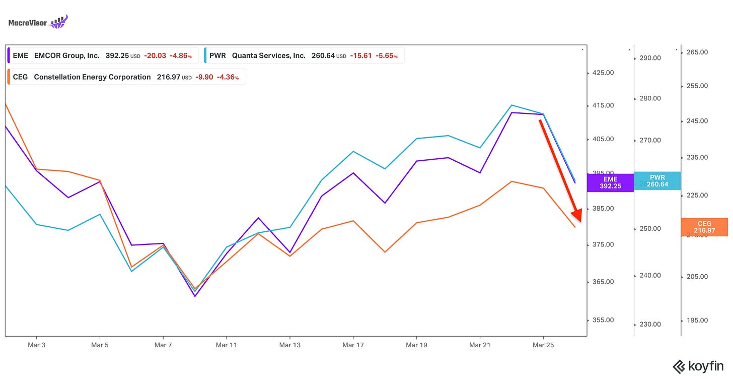 Yesterday, we also saw the power stocks get hit because of this. In the last few months, electric power-related and, even to a certain extent, energy companies have been hanging their hat on the “AI data center expansion” story, and that got trampled on as well. There could be an opportunity here because for a few of these companies, the data center story may have been played up, but they also have other strong underlying demand forces. Something to keep an eye on.