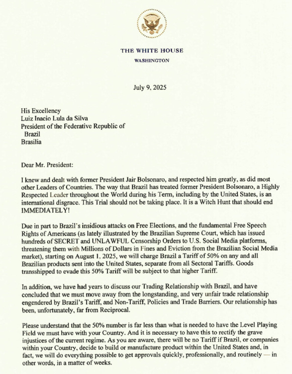 Speaking of tariffs, we’ve now moved from reciprocal to retaliatory. John Authers from Bloomberg points out this morning that tariffs are no longer about trade but rather about politics. He states Brazil as one example, and here’s the letter sent to them.