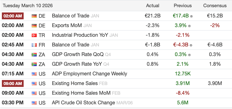 China’s trade numbers were a blowout. January-February exports surged 21.8% year-on-year, with February-only growth estimated near 40%, and the trade surplus hit $213.6 billion against a $196.6 billion consensus. ASEAN and EU exports were both up around 20%, while US-bound exports fell nearly 17% in the combined period, though implied February-only US exports rose 9.7%.