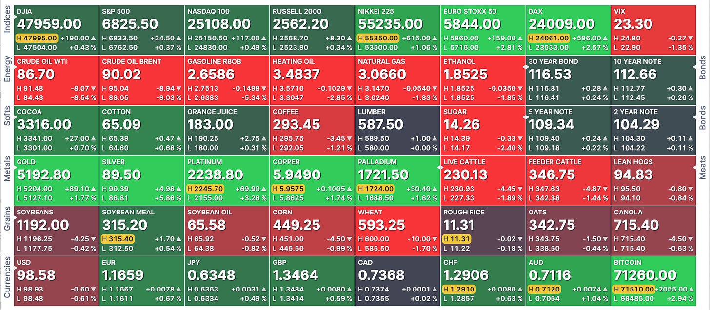 US futures are choppy but holding in the green despite the VIX staying above 23. Precious metals and Bitcoin are recovering alongside a softer dollar. Soft agricultural commodities are under pressure, with reports of fertilizer shortages adding a new layer of concern for food markets.