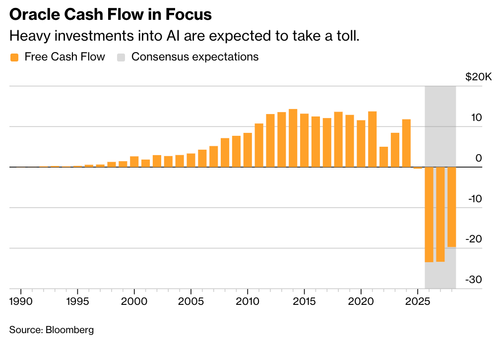 Oracle reports earnings after the bell today, and the bar is simultaneously high and treacherous. The market expects roughly 20% revenue growth and an 82% jump in cloud infrastructure sales, but investors are less focused on the top line than on capital expenditure guidance. Oracle is on track to spend over $50 billion on capex this fiscal year, and negative free cash flow has become a real concern. (the chart below is quite remarkable). We’ve talked about this: Too much spending spooks the market; too little raises questions about its ability to compete. So management in a difficult position either way.