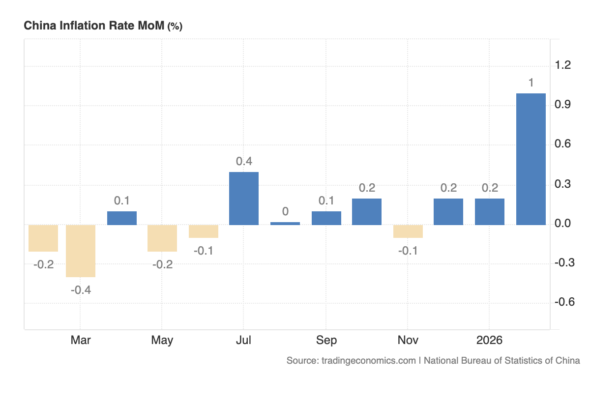 The PPI details matter here. Deflation is easing across production materials and intermediate goods, and processed goods prices actually turned positive at 0.3%. Premier Li flagged an “appropriate rebound” in prices as a key monetary policy goal. China may be shifting from exporting deflation to exporting inflation, and that changes a lot of things.