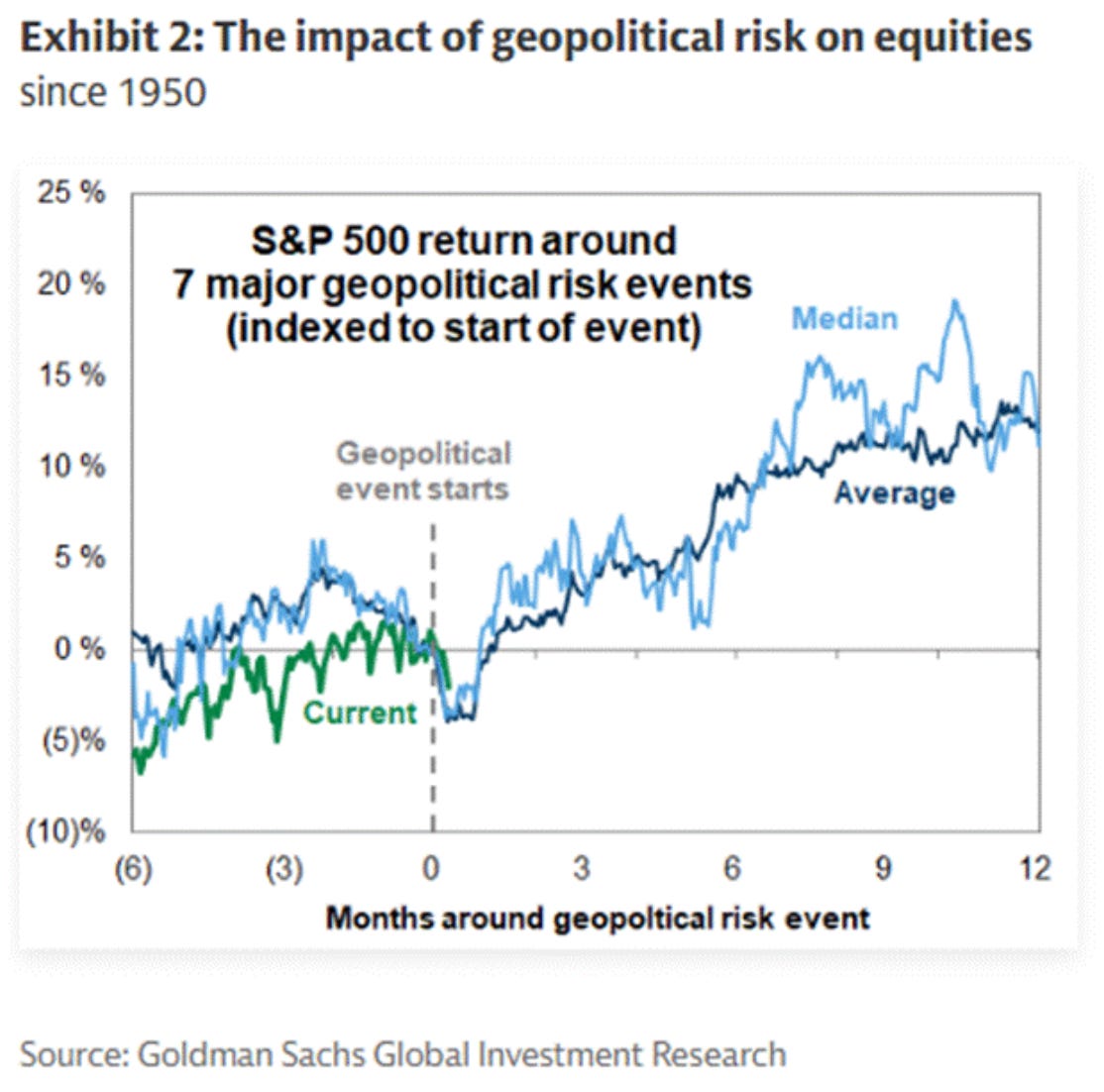 “During seven geopolitical risk episodes since 1950, the S&P 500 declined by an average of 4% in the first week but recovered within the subsequent month.” - GS