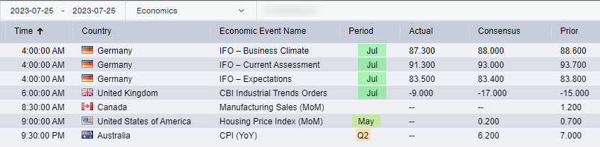 The German Ifo business climate survey for July sees further deterioration to 87.3 versus consensus 88.0 and prior 88.5.