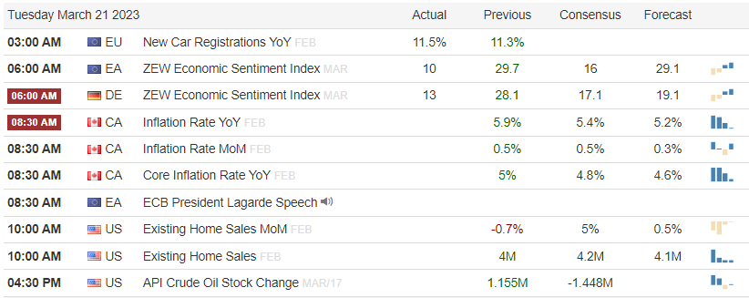 It’s a quiet Tuesday before the Fed tomorrow. US Futures are up and the SPY is up about 0.80% in the pre-market. Gold has given up some of its gains along with the USD Index (DXY), while Oil is rallying, crossing $68/bbl this morning. Bitcoin remains above $28000. The market is showing slight reprieve from recession fears.