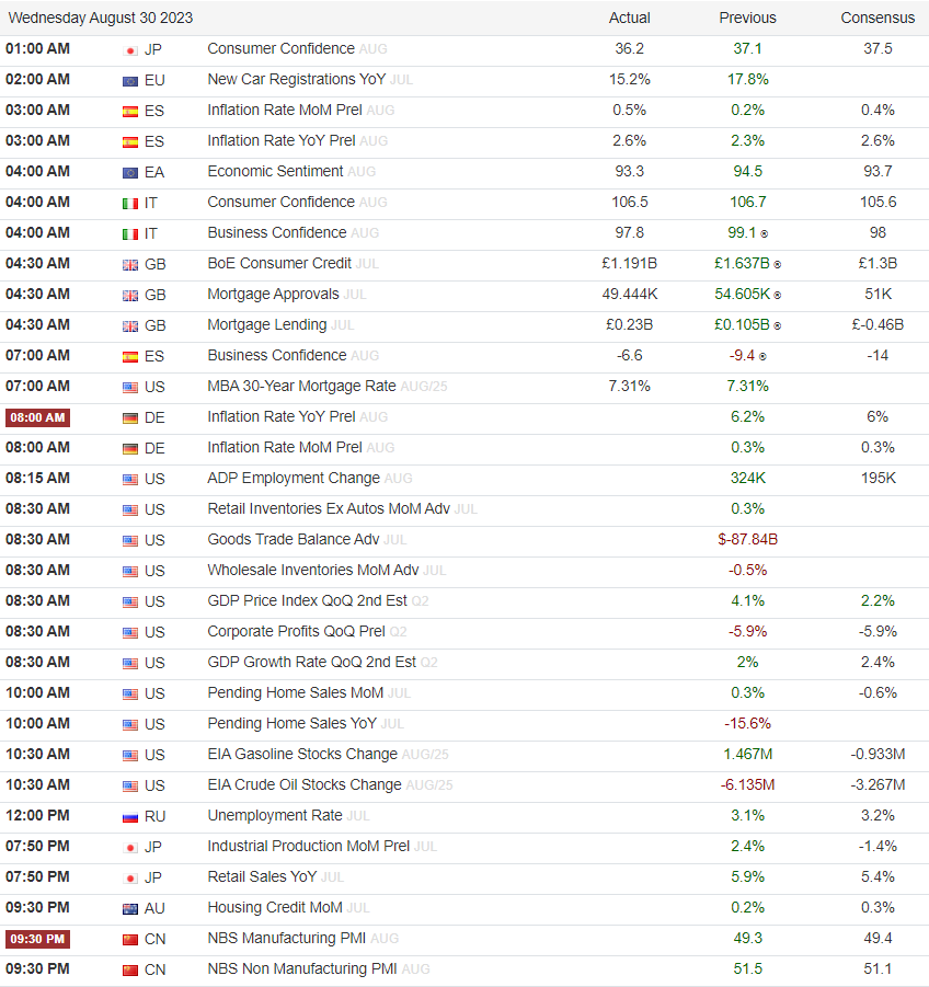 The major economic update today is the ADP employment numbers and German Inflation numbers that’s set to be released at 8am ET. We’re seeing some of the regional German inflation numbers pouring in with a mixed picture - 4 of 6 regions are marginally higher. These inflation numbers lead into the Eurozone numbers tomorrow and will be an important factor to consider before the ECB’s September rate decision.