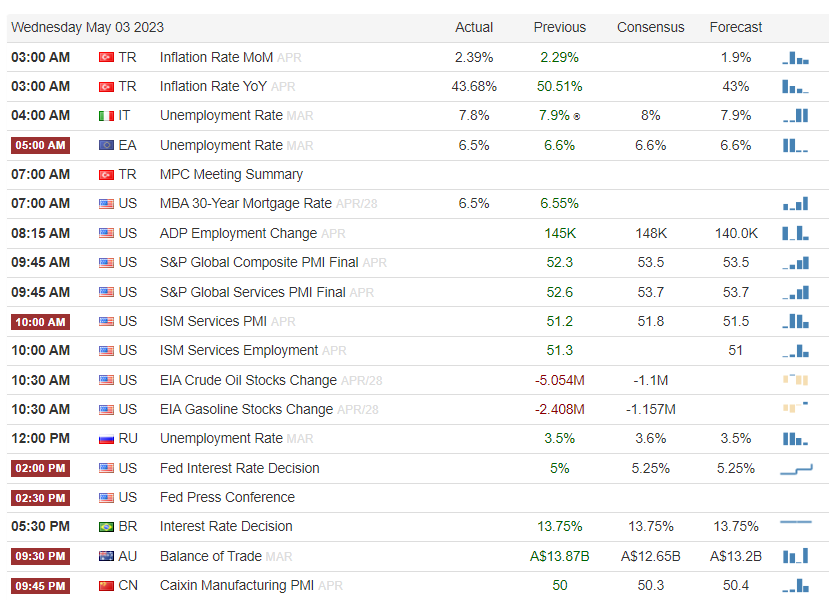 FOMC rate decision today; ECB rate decision tomorrow; Debt ceiling issues continue.