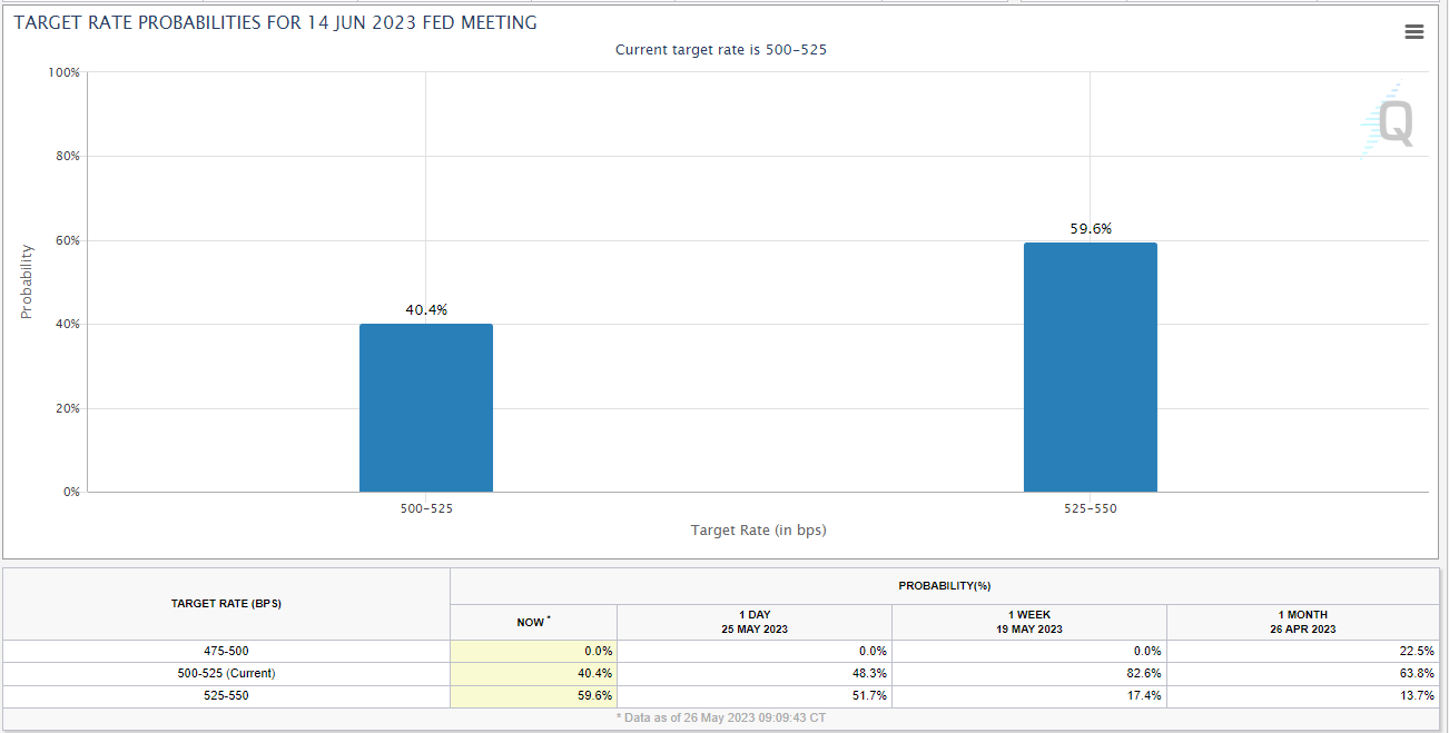 The market is now pricing in a 59.6% probability of a rate hike during the 14 June Fed meeting. One week ago, the probability was only at 17.4%.