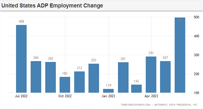 The ADP Private Sector jobs report came in much higher than expected showing an increase of 497k vs. the previous month’s 267k.