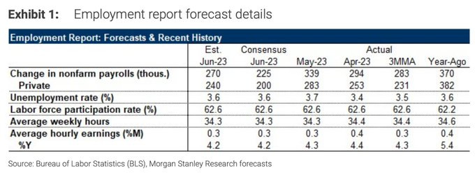 This is why the forecast is for the unemployment rate to decline. Morgan Stanley forecasts a much higher number for NFP but, a 3.6% rate for unemployment.