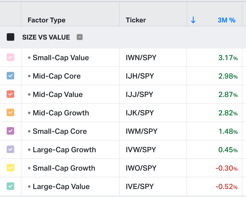 A look at factor performance for the last 3 months shows us that value and mid-caps seemed to have fared better than the rest. (Granted this is based on ETFs but it still gives us a flavor how the markets moved). ⤵️